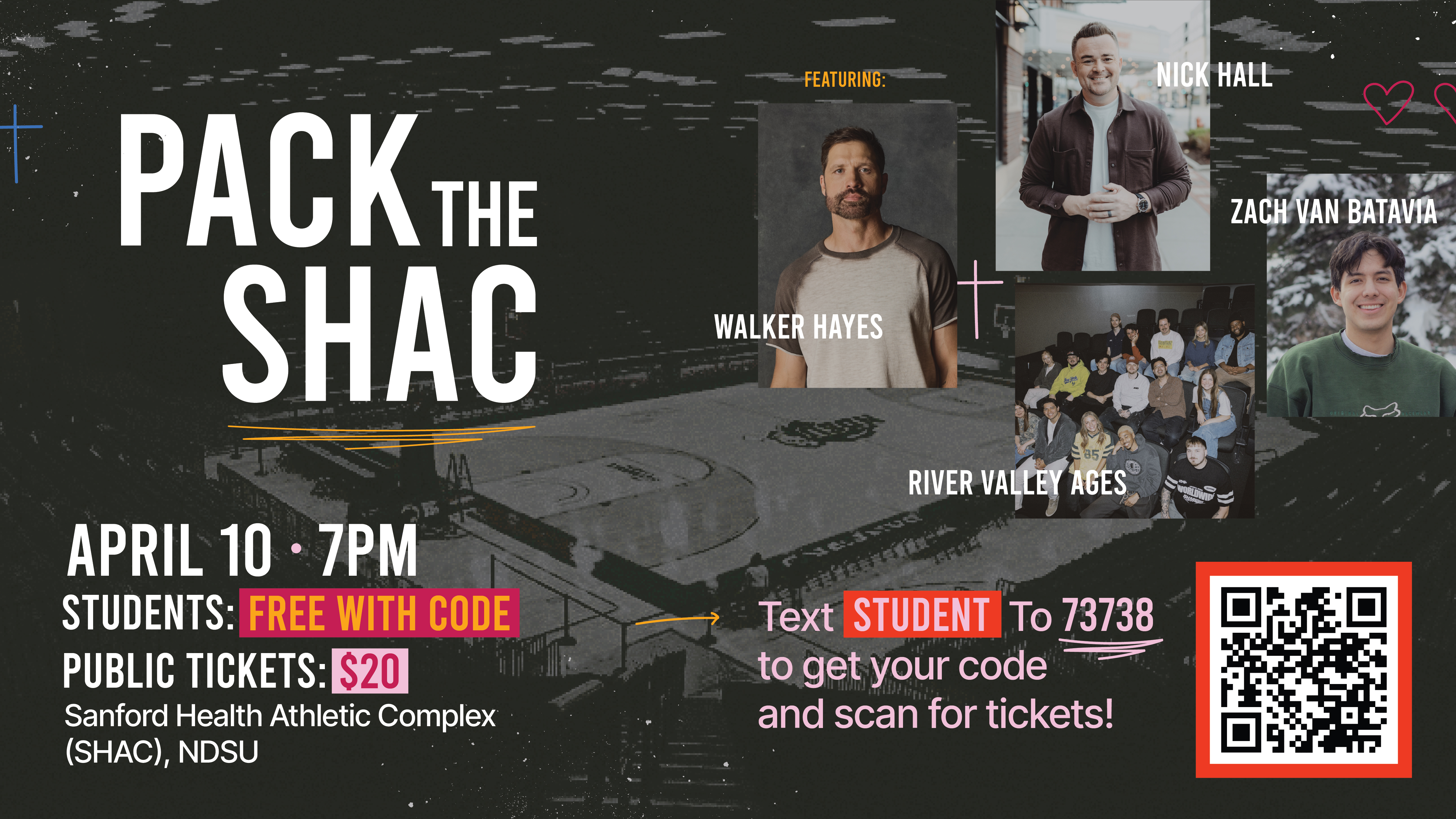 Pack the SHAC is a community-wide outreach event hosted by Pulse and True Love on the NDSU campus meant to bring students to Christ. It’s free for students using the code above, and $20 for general tickets. You can, however, join the event by volunteering using this link.